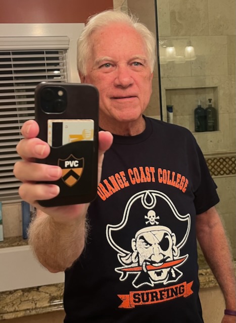 Hayes presented Head Football Coach Bob Surace ‘90 and Athletics Director John Mack ‘00 with tee shirts (here modeled by surfer wannabe Rickerson) from the Orange Coast College Surfing & Ocean Safety class which he has taught for over 40 years. Hayes suggested to John Mack that he add surfing to the list of sports offered at Princeton and even offered his coaching services for a nominal stipend!